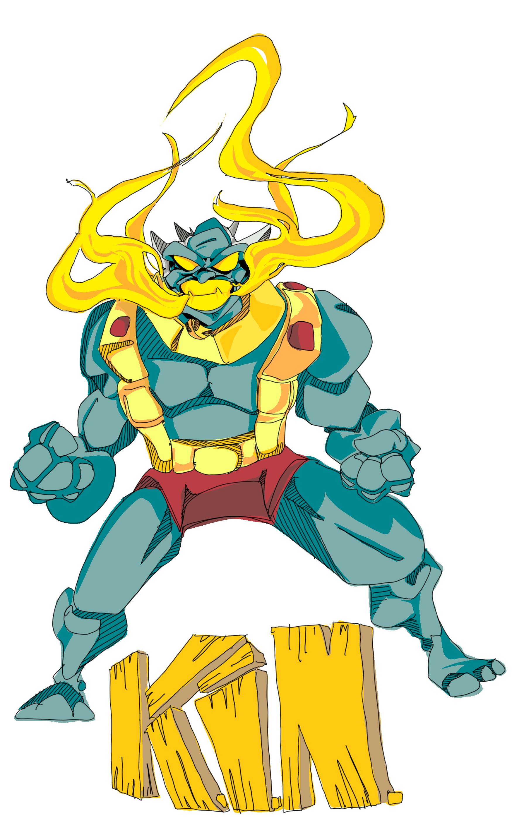 What emerged from the lab was no longer a majestic beast, but a feral gangster in scale-armor—a thug with a volcanic temper and enough brute strength to tear through tanks. Kin escaped during one of The Gray Man’s “trial purges,” scorching his way through security and bartering survival with the cyber-assassin Air-O-Pain, trading mercy for a gold-plated Flight Harness.